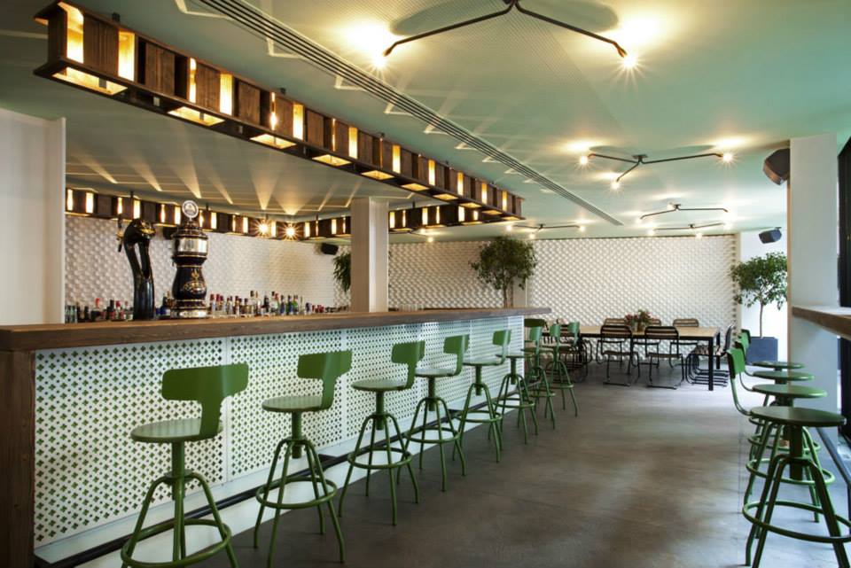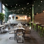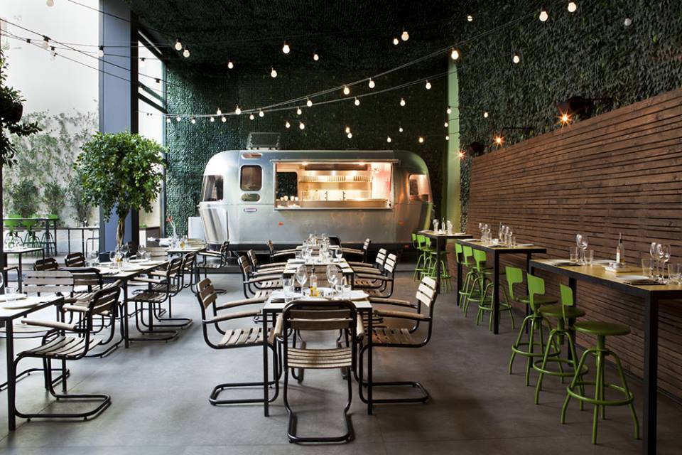 O διώροφος κεντρικός χώρος φιλοξενεί το τροχήλατο airstream με πλήρως εξοπλισμένη κουζίνα όπου οι σεφ παρασκευάζουν τα γεύματα από φρέσκα εποχιακά λαχανικά. Ο τεχνητός κισσός που καλύπτει τοίχους και οροφή και το υπερμεγέθες ξύλινο παγκάκι δημιουργούν ένα σουρεαλιστικό χώρο ταυτόχρονα ζεστό από τους φωτιστικούς γλόμπους, τις ξύλινες αναπαυτικές καρέκλες, τα πράσινα σκαμπώ και τα κίτρινα τραπέζια. Οι λιτές και καθαρές γραμμές τονίζονται από τη χρωματική παλέτα του λευκού και τόνων του πράσινου.