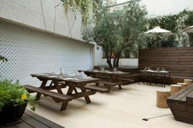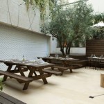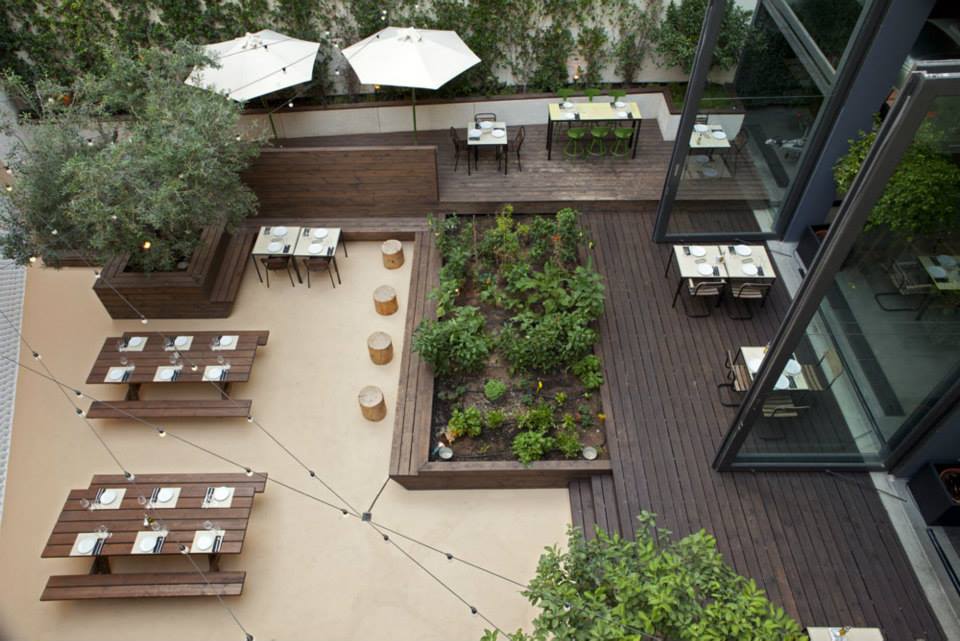 Διαμορφωμένο σε διάφορα επίπεδα από ξύλινες πλατφόρμες και καθιστικούς πάγκους, τραπέζια πικ νικ, μπαξέδες με λαχανικά, φρούτα και μυρωδικά και παρτέρια με λουλούδια. Κάτω από την σκιά που δημιουργούν οι ομπρέλες και τα δένδρα οι επισκέπτες απολαμβάνουν το φαγητό και το ποτό τους κατά την διάρκεια της ημέρας.