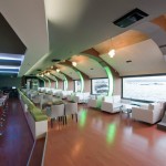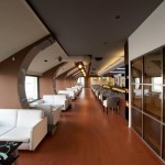 Στο εσωτερικό, θα βρείτε ένα φουτουριστικό χώρο με λευκούς καναπέδες και καμπύλες επιφάνειες.