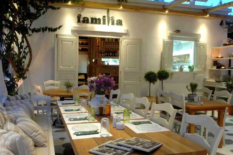 Φτιαγμένο με πολύ μεράκι και σεβόμενο απόλυτα το απλό παραδοσιακό Μυκονιάτικο αρχιτεκτονικό στυλ, το εστιατόριο Familia διαμορφώθηκε με διακριτικές παρεμβάσεις στο ήδη εκπληκτικό και γραφικό τοπίο της πλατείας Γουμενιό για να σας μοναδικές στιγμές γαστρονομικής απόλαυσης! Την προσεγμένη διακόσμηση του εστιατορίου πλαισιώνουν φούξια μπουκαμβίλιες και απαλός φωτισμός το βράδυ, περιτρυγιρισμένα από το γνωστό μυκονιάτικο τοπίο με τα άσπρα σπιτάκια και τα μπλε παράθυρα.