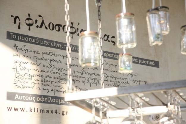 Εκλεκτές βραδιές οίνων και γεύσεων, επιλεγμένες παρουσιάσεις βιβλίων και μουσικά γεγονότα προτείνουν κάθε φορά στους πολίτες της Λάρισας κάτι διαφορετικό με σκοπό την γνώση και την επικοινωνία. H εξυπηρέτηση είναι self service και ο μη καπνιστής αντιμετωπίζεται με σεβασμό, η ποιότητα ζωής άλλωστε προκύπτει από τις επιλογές μας υποδηλώνοντας ότι ο πολιτισμός μας είναι τόσο τα ερεθίσματα που λαμβάνουμε όσο και η διατροφή που επιλέγουμε.