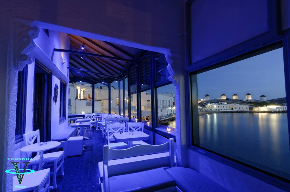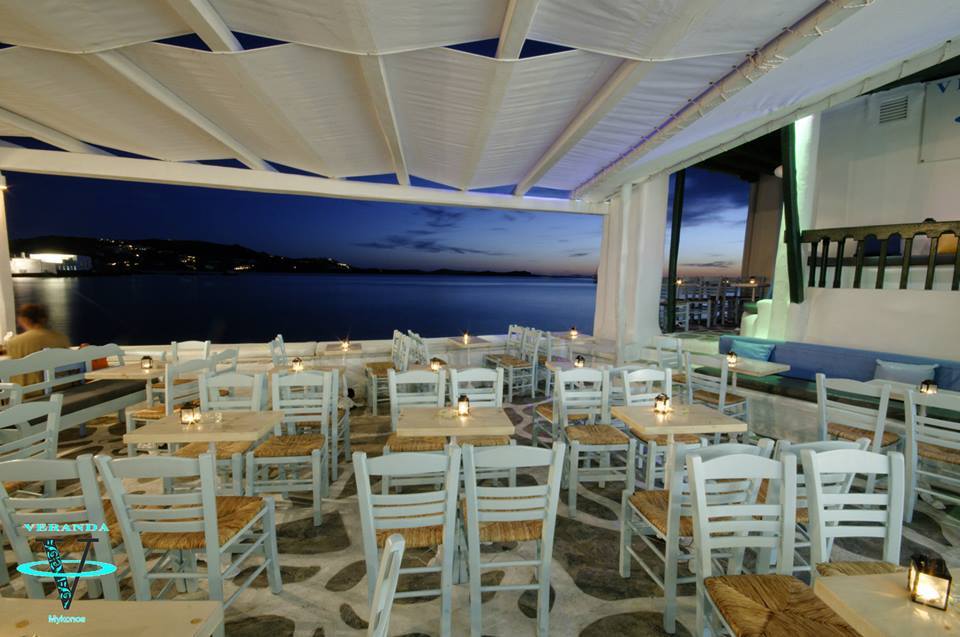 Είμαστε ανοιχτά από νωρίς το πρωί για καφέ, πρωινό ή ένα σνακ στην πλατεία μας δίπλα από θάλασσα του Αιγαίου και την μαγευτική θέα προς τους ανεμόμυλους, που αποτελούν μιά από τις πιο χαρακητριστικές εικόνες της Μυκόνου και βρίσκονται σε απόσταση μόλις 200μ. Κατά τη διάρκεια της βραδιάς είστε σε θέση να απολάυστε τον πολύχρωμο ουρανό καθώς ο ήλιος δύει, συνοδευόμενοι από εύγεστα κοκτέιλ και μουσική. Μπορείται να πιείτε τα κοκτέιλ σας είτε στην γραφική πλατεία μας ή στην πράσινη βεράντα του πρώτου ορόφου. Αργά το βράδυ μπορείτε να ζήσετε τη νυχτερινή ζωή της Μυκόνου επιλέγοντας ανάμεσα σε δύο διαφορετικά είδη μουσικής, σε δύο διαφορετικές σκηνές. Το Veranda Bar είναι το πρώτο και μοναδικό μπαρ στη Μύκονο με δύο σκηνές! Ισόγειο (Cocktail Bar) – House, Techno, Deep House, Minimal House. Πρώτος όροφος (Cocktail Lounge) – Old School Music, 80’s, Funky, Rock & Roll,  Latin. Αν θέλετε να κάνετε κράτηση, μπορείτε να επιλέξετε ανάμεσα σε ένα θάλαμο, ένα τραπέζι ή σε ένα πάγκο. Όποια και αν είναι η διάθεσή σας, το Veranda Cafe-Cocktail Bar είναι ο ιδανικός προορισμός.