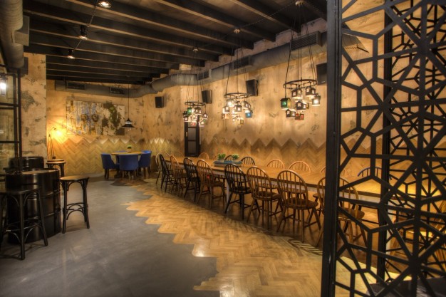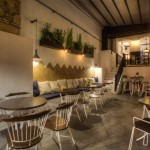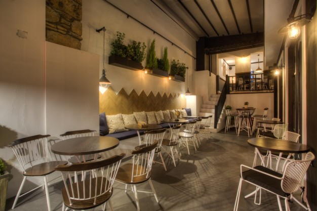 Τέσσερις χώροι: μια μικρή ημι-υπαίθρια αυλή με πτυσσόμενη οροφή, ένα πολύβουο πέτρινο μπαρ στα δεξιά, μια σάλα με ένα μοναστηριακό τραπέζι στο κέντρο να διεκδικεί την προσοχή, κι ένα lounge στον ημιόροφο με την επιγραφή «READ», σαν προτροπή χαλάρωσης.