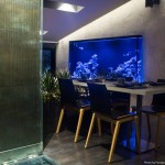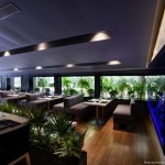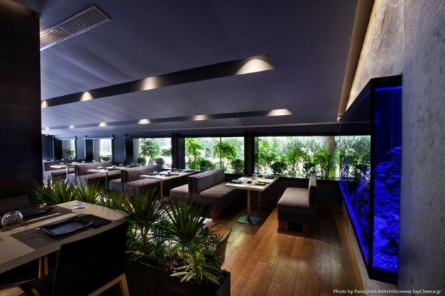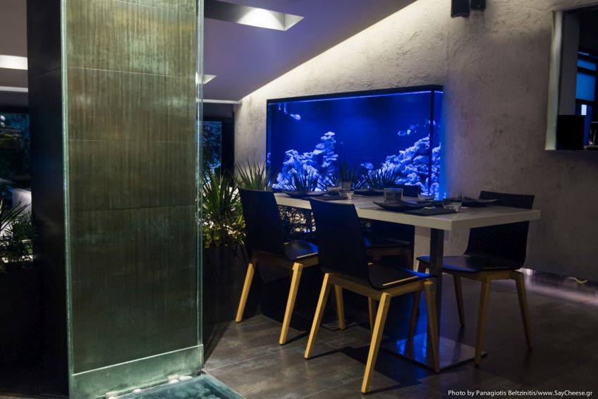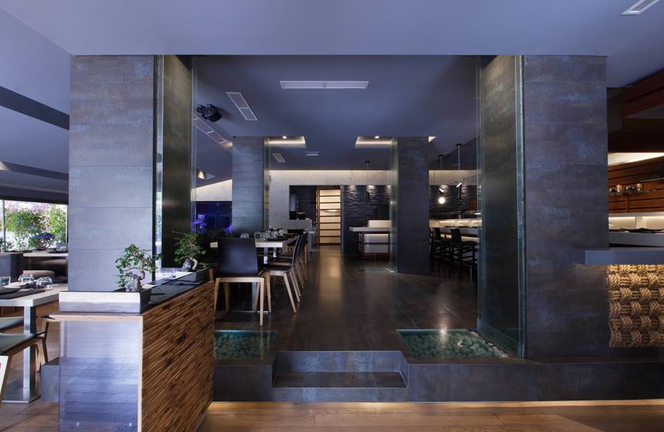 Η μινιμαλιστική αισθητική του χώρου στους τόνους του γκρι, το εντυπωσιακό ενυδρείο και οι κολώνες που τρέχουν νερό εκφράζουν το σύμβολο tomoe και τη γιαπωνέζικη φιλοσοφία που περιστρέφεται γύρω από την κυκλική ροή της ενέργειας και την κίνηση του νερού.